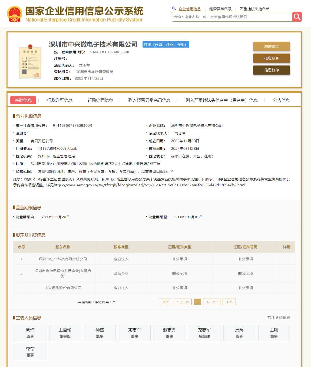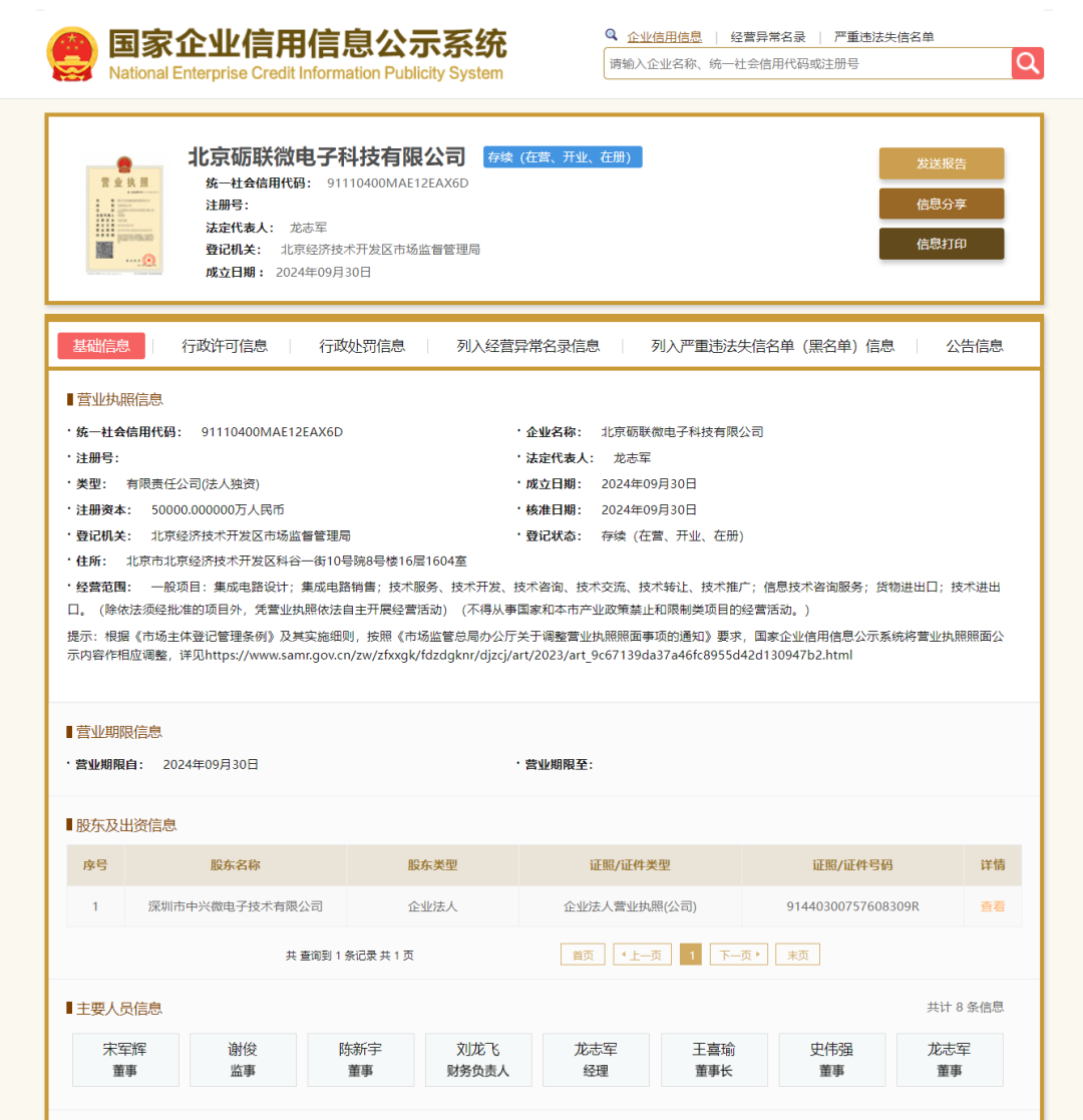 据国家企业信用信息公示系统显示,北京砺联微电子科技有限公司的注册资本为5亿元人民币,法定代表人为龙志军,他也是深圳市中兴微电子技术有限公司的法定代表人。此外,砺联微电子的董事长由中兴通讯股份有限公司执行副总裁、首席技术官、首席信息官王喜瑜担任,他同时也是深圳市中兴微电子技术有限公司的董事长。