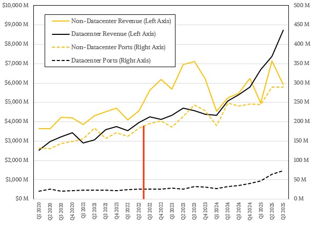 但由于其横向扩展能力(这对于推动规模庞大的 AI 集群至关重要)和通用性,以太网交换机的销量正在蓬勃发展,如果最近的历史可以作为参考,我们可以预期以太网的收入在未来几个季度也将呈指数级增长。