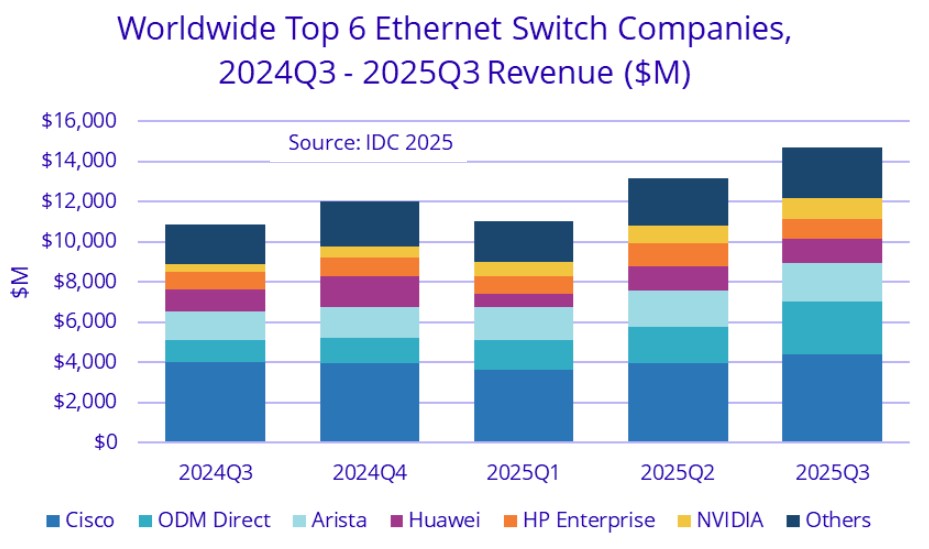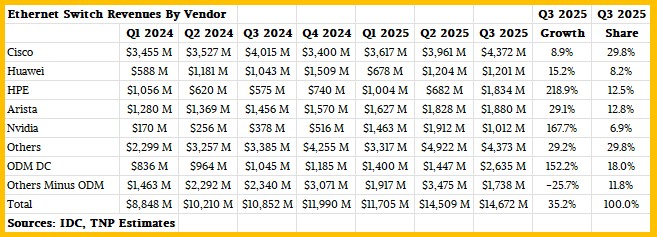 我们将密切关注英伟达的绿色增长线在2025年第四季度、2026年第一季度和第二季度的业绩数据公布后能否保持稳定,但目前看来非常明显的是,截至2025年第三季度,ODM厂商作为一个整体已占据数据中心以太网交换机收入的主导地位。随着ODM厂商和英伟达的崛起,现有厂商——主要是思科、Arista以及可能还有华为——正面临压力。但随着压力的增加,数据中心以太网市场仍在扩张,目前看来,所有厂商都有足够的增长空间。至少目前如此。