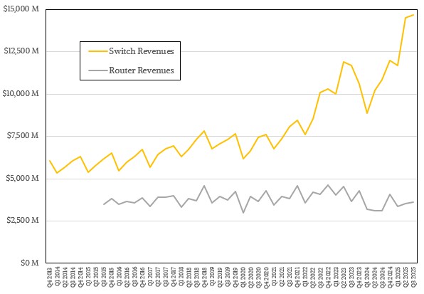 剩下的就是路由设备了。2025年第三季度,路由设备销售额略高于36亿美元,同比增长15.8%,环比增长2.5%。服务提供商、超大规模数据中心和云平台建设商占该季度路由器销售额的74%,同比增长20.2%,这意味着,如果按企业级市场计算,路由器销售额仅增长了4.9%,达到9.4亿美元。