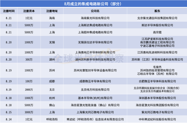 事实上,除了新紫光集团之外,8月份以来,集成电路领域一批新公司相继成立。从地区来看,新公司范围分布在上海、杭州、佛山、无锡、苏州、成都、呼和浩特等地。从产业链来看,此次新成立的公司涵盖功率半导体、IC设计、半导体设备等领域。