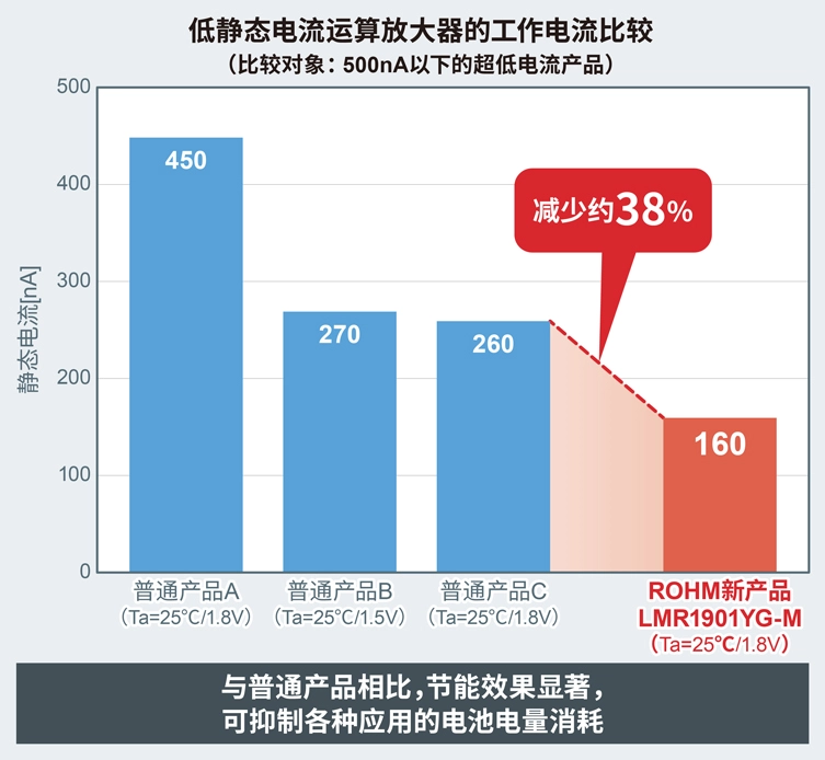 新产品采用ROHM自有的超低静态电流技术,彻底抑制了因温度和电压变化而导致的电流增加问题,与普通的低静态电流运算放大器相比,静态电流减少约38%,仅为160nA(Typ.)。这不仅可延长由内置电池供电的电子货架标签等应用的使用寿命,还有助于延长配备充电电池的智能手机等应用的续航时间。另外,在-40℃~+105℃的工作温度范围内,静态电流几乎不变,因此即使在火灾报警器和环境传感器等外部温度会发生变化的环境中,也能稳定地省电运行。