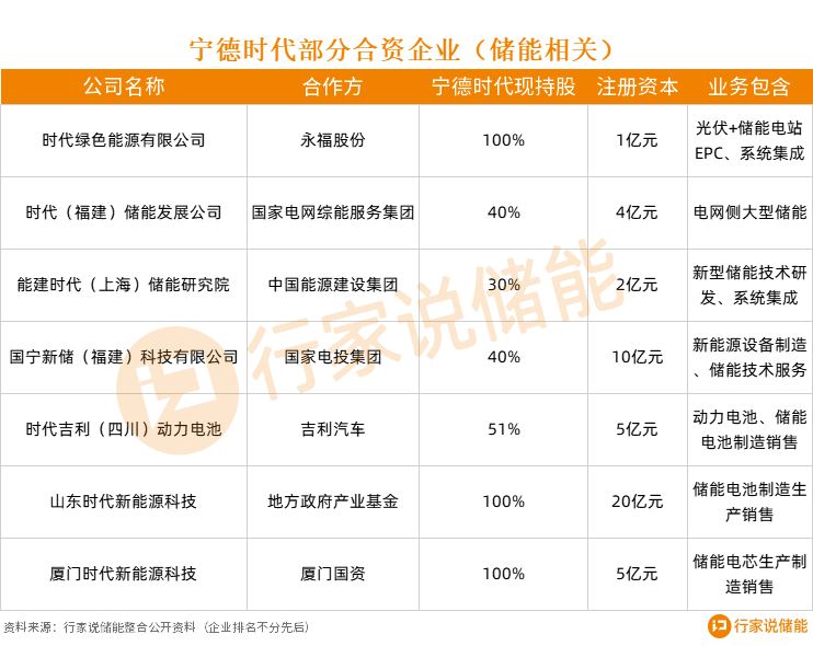 作为储能产业龙头,宁德时代近年来加强与国家电网、中国能建、国家电投集团、厦门国资等大型国企合作,成立合资/合营公司,业务范围涵盖了EPC、系统集成、电池制造等,构建了强大的储能生态圈。