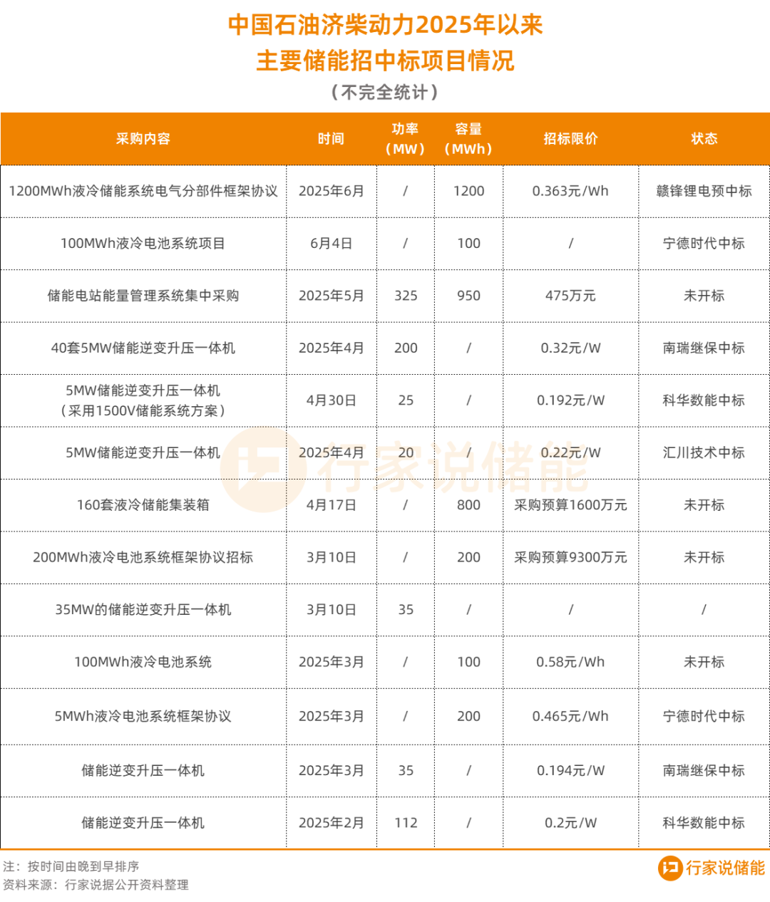 另据行家说储能不完全统计,2025年以来,中国石油集团济柴动力有限公司先后发布了超10多项储能相关采购信息,涵盖了储能电池系统、逆变升压一体机、能量管理系统等。