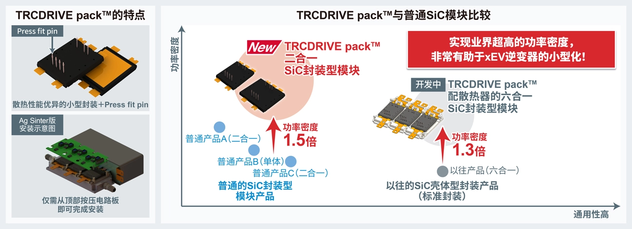 TRCDRIVE pack™是牵引逆变器驱动用SiC封装型模块的专用商标,标有该商标的产品利用ROHM自有的结构,更大程度地扩大了散热面积,从而实现了紧凑型封装。另外,新产品还搭载了低导通电阻的第4代SiC MOSFET,实现了是普通SiC封装型模块1.5倍的业界超高功率密度,非常有助于xEV逆变器的小型化。