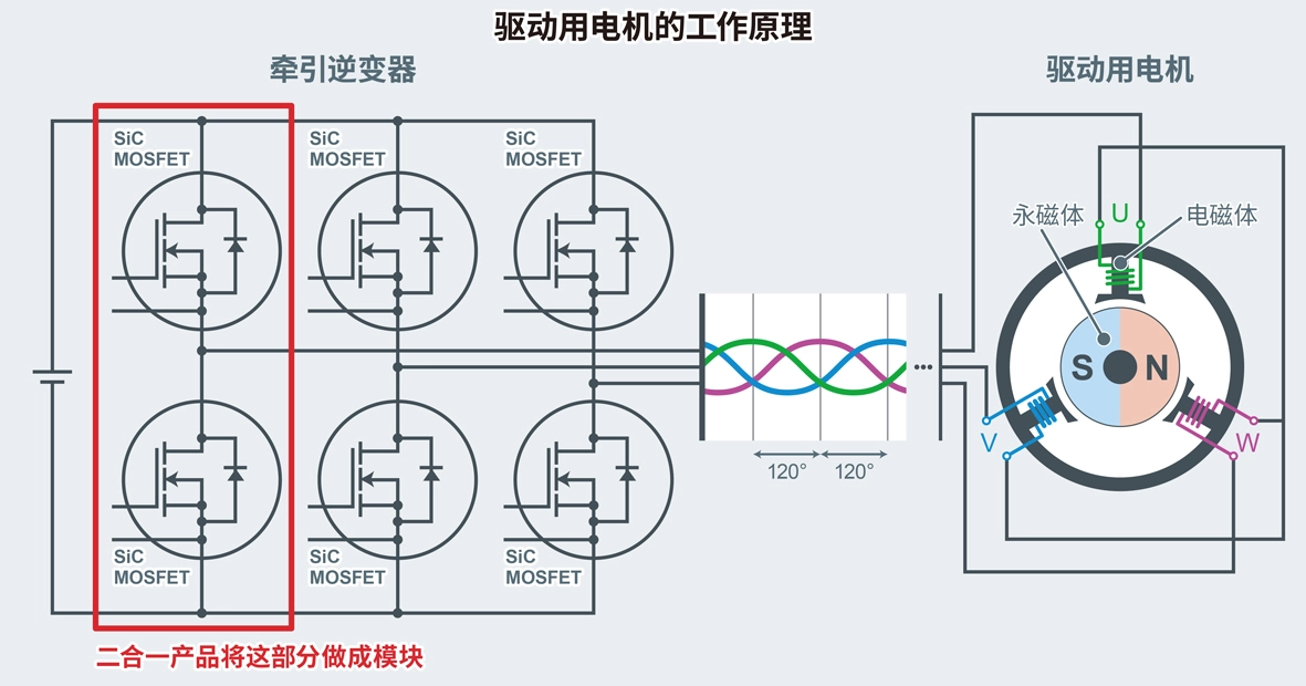 电动汽车的驱动电机采用的是相位差为120度的三相交流电驱动。将来自电池的直流电转换为交流电以实现这种三相交流电的逆变器即牵引逆变器。